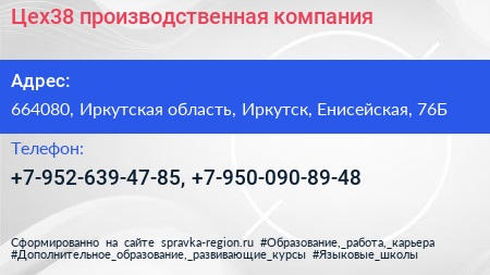 Цех38, производственная компания по адресу 664080, Иркутская область, Иркутск, Енисейская, 76Б в дальнейшем Организация, размещена в следующих категориях: