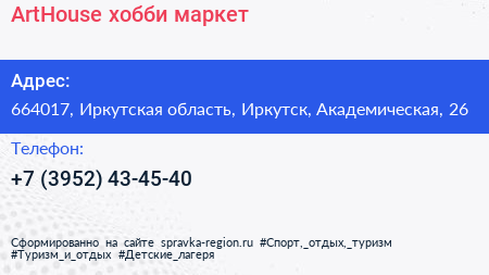 ArtHouse, хобби-маркет по адресу 664017, Иркутская область, Иркутск, Академическая, 26 в дальнейшем Организация, размещена в следующих категориях: