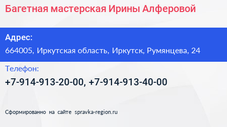 Багетная мастерская Ирины Алферовой по адресу 664005, Иркутская область, Иркутск, Румянцева, 24 в дальнейшем Организация, размещена в следующих категориях: