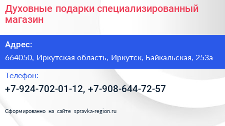 Духовные подарки, специализированный магазин по адресу 664050, Иркутская область, Иркутск, Байкальская, 253а в дальнейшем Организация, размещена в следующих категориях: