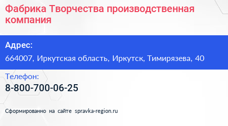 Фабрика Творчества, производственная компания по адресу 664007, Иркутская область, Иркутск, Тимирязева, 40 в дальнейшем Организация, размещена в следующих категориях: