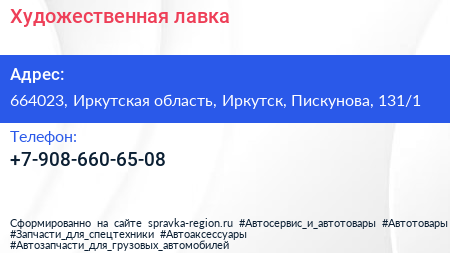 Художественная лавка по адресу 664023, Иркутская область, Иркутск, Пискунова, 131/1 в дальнейшем Организация, размещена в следующих категориях: