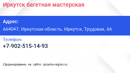 Иркутск, багетная мастерская по адресу 664047, Иркутская область, Иркутск, Трудовая, 66 в дальнейшем Организация, размещена в следующих категориях: