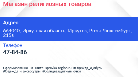 Магазин религиозных товаров по адресу 664040, Иркутская область, Иркутск, Розы Люксембург, 215в в дальнейшем Организация, размещена в следующих категориях: