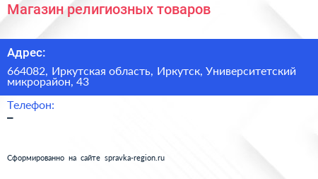 Магазин религиозных товаров по адресу 664082, Иркутская область, Иркутск, Университетский микрорайон, 43 в дальнейшем Организация, размещена в следующих категориях: