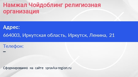 Намжал Чойдоблинг, религиозная организация по адресу 664003, Иркутская область, Иркутск, Ленина, 21 в дальнейшем Организация, размещена в следующих категориях: