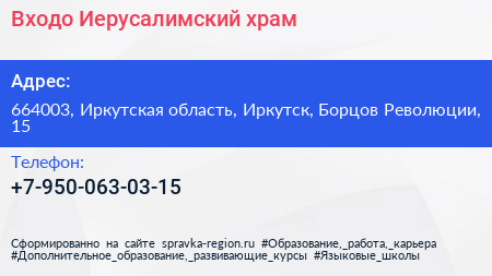 Входо-Иерусалимский храм по адресу 664003, Иркутская область, Иркутск, Борцов Революции, 15 в дальнейшем Организация, размещена в следующих категориях: