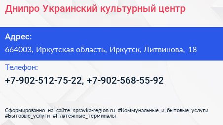 Днипро, Украинский культурный центр по адресу 664003, Иркутская область, Иркутск, Литвинова, 18 в дальнейшем Организация, размещена в следующих категориях: