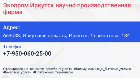 Экопром-Иркутск, научно-производственная фирма по адресу 664033, Иркутская область, Иркутск, Лермонтова, 134 в дальнейшем Организация, размещена в следующих категориях: