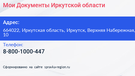 Мои Документы Иркутской области по адресу 664022, Иркутская область, Иркутск, Верхняя Набережная, 10 в дальнейшем Организация, размещена в следующих категориях: