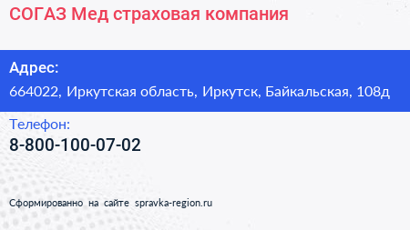СОГАЗ-Мед, страховая компания по адресу 664022, Иркутская область, Иркутск, Байкальская, 108д в дальнейшем Организация, размещена в следующих категориях: