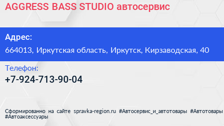 AGGRESS BASS STUDIO, автосервис по адресу 664013, Иркутская область, Иркутск, Кирзаводская, 40 в дальнейшем Организация, размещена в следующих категориях: