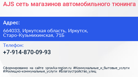 AJS, сеть магазинов автомобильного тюнинга по адресу 664033, Иркутская область, Иркутск, Старо-Кузьмихинская, 71Б в дальнейшем Организация, размещена в следующих категориях: