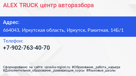 ALEX-TRUCK, центр авторазбора по адресу 664043, Иркутская область, Иркутск, Ракитная, 14Б/1 в дальнейшем Организация, размещена в следующих категориях: