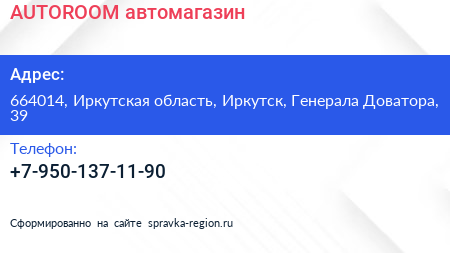 AUTOROOM, автомагазин по адресу 664014, Иркутская область, Иркутск, Генерала Доватора, 39 в дальнейшем Организация, размещена в следующих категориях: