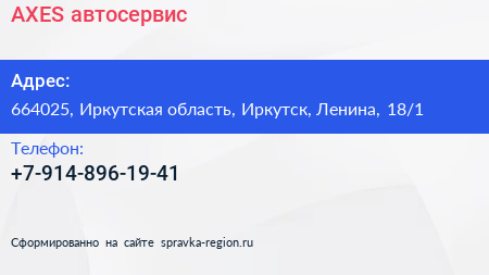 AXES, автосервис по адресу 664025, Иркутская область, Иркутск, Ленина, 18/1 в дальнейшем Организация, размещена в следующих категориях: