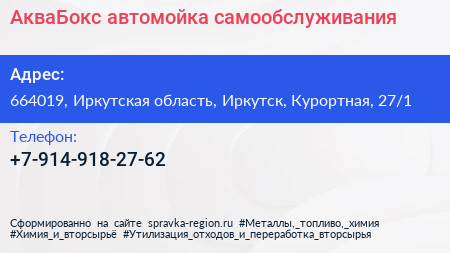 АкваБокс, автомойка самообслуживания по адресу 664019, Иркутская область, Иркутск, Курортная, 27/1 в дальнейшем Организация, размещена в следующих категориях: