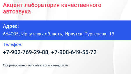 Акцент, лаборатория качественного автозвука по адресу 664005, Иркутская область, Иркутск, Тургенева, 18 в дальнейшем Организация, размещена в следующих категориях: