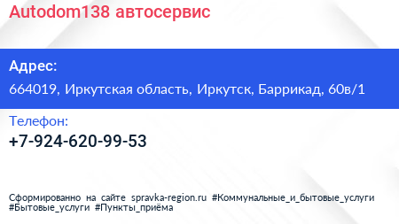 Autodom138, автосервис по адресу 664019, Иркутская область, Иркутск, Баррикад, 60в/1 в дальнейшем Организация, размещена в следующих категориях: