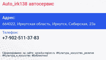 Auto_irk138, автосервис по адресу 664022, Иркутская область, Иркутск, Сибирская, 23а в дальнейшем Организация, размещена в следующих категориях: