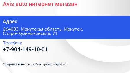 Avis-auto, интернет-магазин по адресу 664033, Иркутская область, Иркутск, Старо-Кузьмихинская, 71 в дальнейшем Организация, размещена в следующих категориях:
