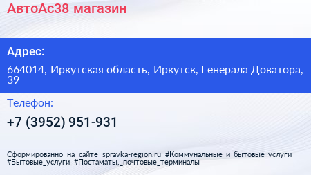АвтоАс38, магазин по адресу 664014, Иркутская область, Иркутск, Генерала Доватора, 39 в дальнейшем Организация, размещена в следующих категориях: