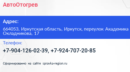 АвтоОтогрев по адресу 664053, Иркутская область, Иркутск, переулок Академика Окладникова, 17 в дальнейшем Организация, размещена в следующих категориях: