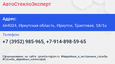 АвтоСтеклоЭксперт по адресу 664024, Иркутская область, Иркутск, Трактовая, 18/1а в дальнейшем Организация, размещена в следующих категориях: