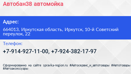 Автобан38, автомойка по адресу 664013, Иркутская область, Иркутск, 10-й Советский переулок, 22 в дальнейшем Организация, размещена в следующих категориях: