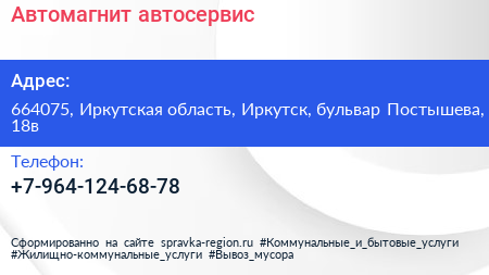 Автомагнит, автосервис по адресу 664075, Иркутская область, Иркутск, бульвар Постышева, 18в в дальнейшем Организация, размещена в следующих категориях: