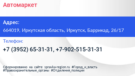 Автомаркет по адресу 664019, Иркутская область, Иркутск, Баррикад, 26/17 в дальнейшем Организация, размещена в следующих категориях: