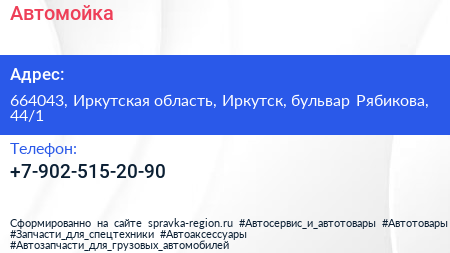 Автомойка по адресу 664043, Иркутская область, Иркутск, бульвар Рябикова, 44/1 в дальнейшем Организация, размещена в следующих категориях: