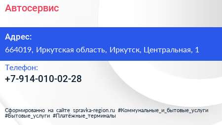 Автосервис по адресу 664019, Иркутская область, Иркутск, Центральная, 1 в дальнейшем Организация, размещена в следующих категориях: