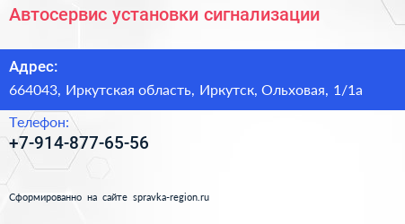 Автосервис установки сигнализации по адресу 664043, Иркутская область, Иркутск, Ольховая, 1/1а в дальнейшем Организация, размещена в следующих категориях: