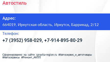 Автостиль по адресу 664019, Иркутская область, Иркутск, Баррикад, 2/12 в дальнейшем Организация, размещена в следующих категориях: