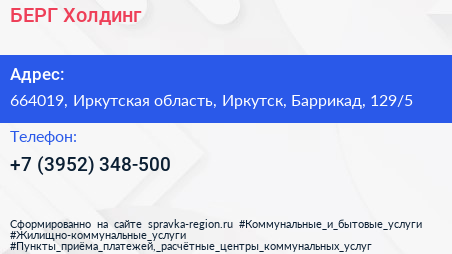 БЕРГ Холдинг по адресу 664019, Иркутская область, Иркутск, Баррикад, 129/5 в дальнейшем Организация, размещена в следующих категориях: