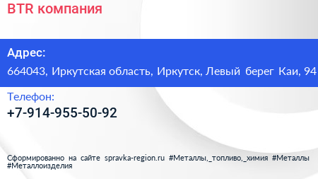 BTR, компания по адресу 664043, Иркутская область, Иркутск, Левый берег Каи, 94 в дальнейшем Организация, размещена в следующих категориях: