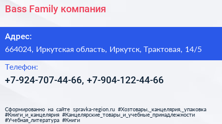 Bass Family, компания по адресу 664024, Иркутская область, Иркутск, Трактовая, 14/5 в дальнейшем Организация, размещена в следующих категориях:
