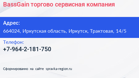 BassGain, торгово-сервисная компания по адресу 664024, Иркутская область, Иркутск, Трактовая, 14/5 в дальнейшем Организация, размещена в следующих категориях:
