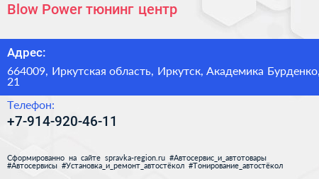 Blow Power, тюнинг-центр по адресу 664009, Иркутская область, Иркутск, Академика Бурденко, 21 в дальнейшем Организация, размещена в следующих категориях: