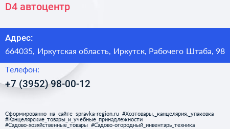 D4, автоцентр по адресу 664035, Иркутская область, Иркутск, Рабочего Штаба, 98 в дальнейшем Организация, размещена в следующих категориях: