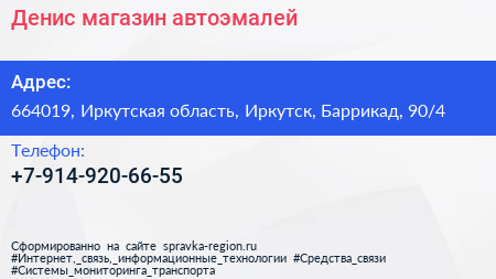 Денис, магазин автоэмалей по адресу 664019, Иркутская область, Иркутск, Баррикад, 90/4 в дальнейшем Организация, размещена в следующих категориях: