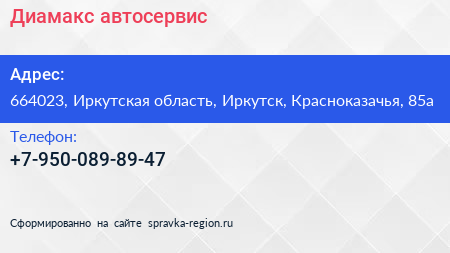 Диамакс, автосервис по адресу 664023, Иркутская область, Иркутск, Красноказачья, 85а в дальнейшем Организация, размещена в следующих категориях: