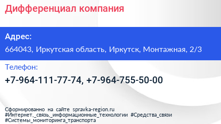 Дифференциал, компания по адресу 664043, Иркутская область, Иркутск, Монтажная, 2/3 в дальнейшем Организация, размещена в следующих категориях: