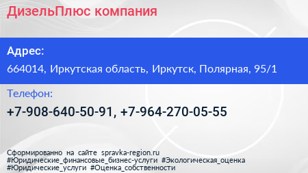 ДизельПлюс, компания по адресу 664014, Иркутская область, Иркутск, Полярная, 95/1 в дальнейшем Организация, размещена в следующих категориях: