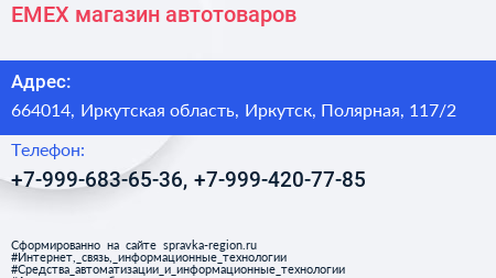 EMEX, магазин автотоваров по адресу 664014, Иркутская область, Иркутск, Полярная, 117/2 в дальнейшем Организация, размещена в следующих категориях: