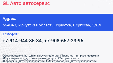 GL-Авто, автосервис по адресу 664043, Иркутская область, Иркутск, Сергеева, 3/8л в дальнейшем Организация, размещена в следующих категориях: