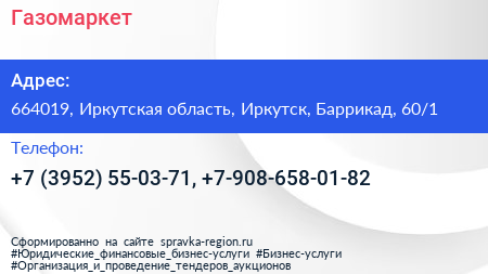 Газомаркет по адресу 664019, Иркутская область, Иркутск, Баррикад, 60/1 в дальнейшем Организация, размещена в следующих категориях: