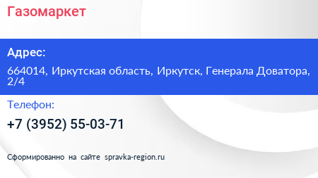 Газомаркет по адресу 664014, Иркутская область, Иркутск, Генерала Доватора, 2/4 в дальнейшем Организация, размещена в следующих категориях: