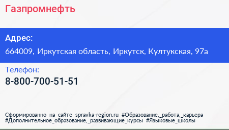 Газпромнефть по адресу 664009, Иркутская область, Иркутск, Култукская, 97а в дальнейшем Организация, размещена в следующих категориях: